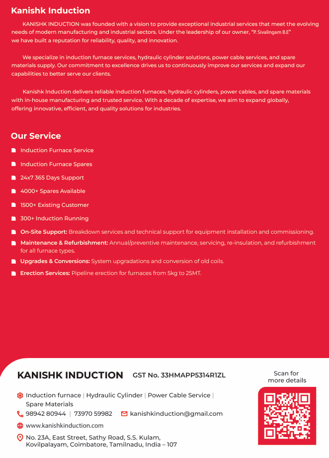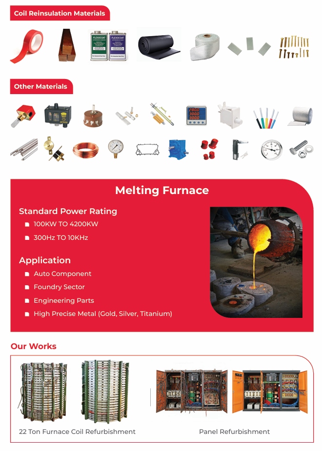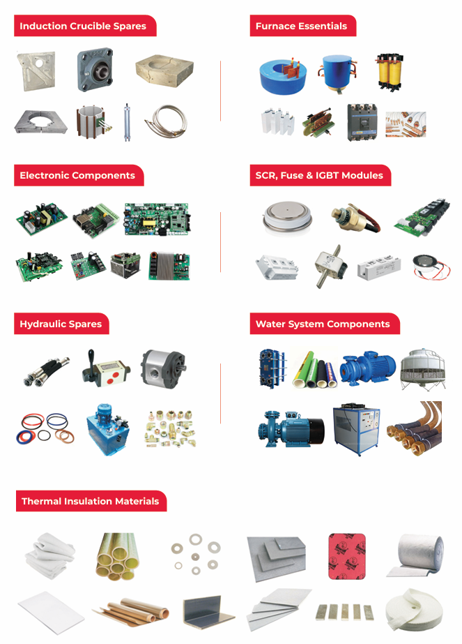 We cover induction furnace service, high‑current cabling, hydraulics, and a broad inventory of spares. Use the quick downloads to share details with your maintenance team.